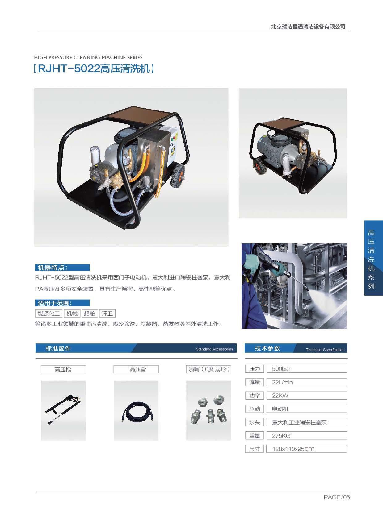 目前,清除道路標線需要用的高壓清洗機壓力達到500Bar才能完美地將標線清除掉,比如瑞潔恒通生產(chǎn)的高壓清洗機RJHT-5022設(shè)計精密,配備齊全,系統(tǒng)壓力也可調(diào)節(jié),可以實現(xiàn)對不同標線漆的清潔。隨著國家對環(huán)境保護意識的增強,標線清除對環(huán)保要求也越來越高,因此用高壓水清洗機清除標線越來越受到事故單位的青睞。