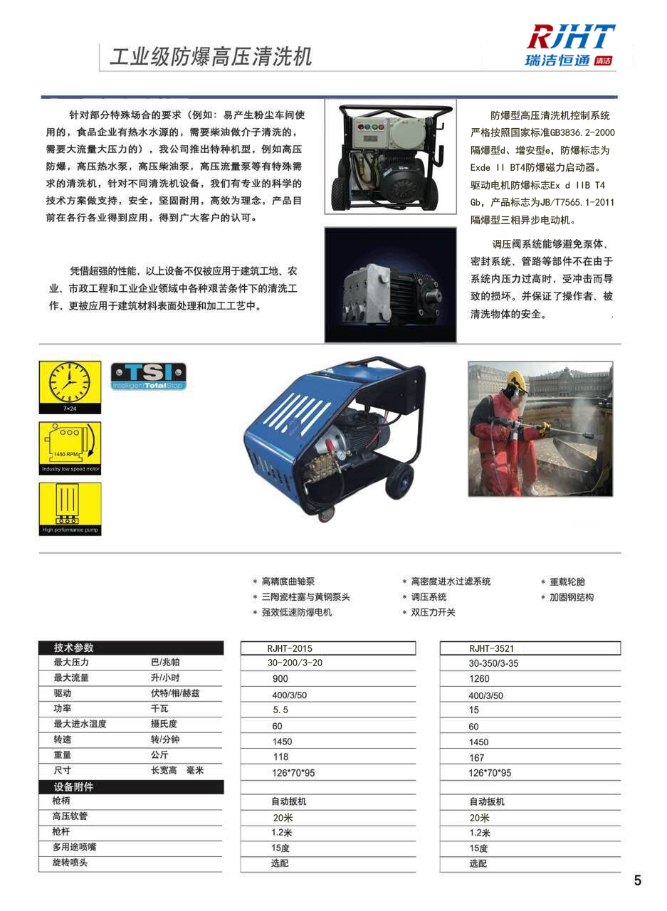 防爆高壓清洗機可為閥門廠、鑄管廠、鋼管廠、壓力容器廠、油田、鹽礦、鹽化廠、采礦廠,化肥廠、化工廠、顏料廠、洗滌廠、磷化工廠、橡膠廠、電爐廠、鋼鐵廠、鍛造廠、合金粉末、冶煉、水泥廠、海軍、海洋運輸,火力發(fā)電廠、熱電廠、造紙廠、煉油廠、純堿廠、氧化鋁廠、合成橡膠廠、乙烯廠、TDI廠氯堿廠、糖廠、制藥廠等行業(yè)的生產(chǎn)過程提供服務(wù)。