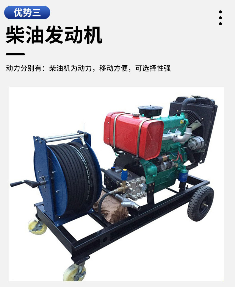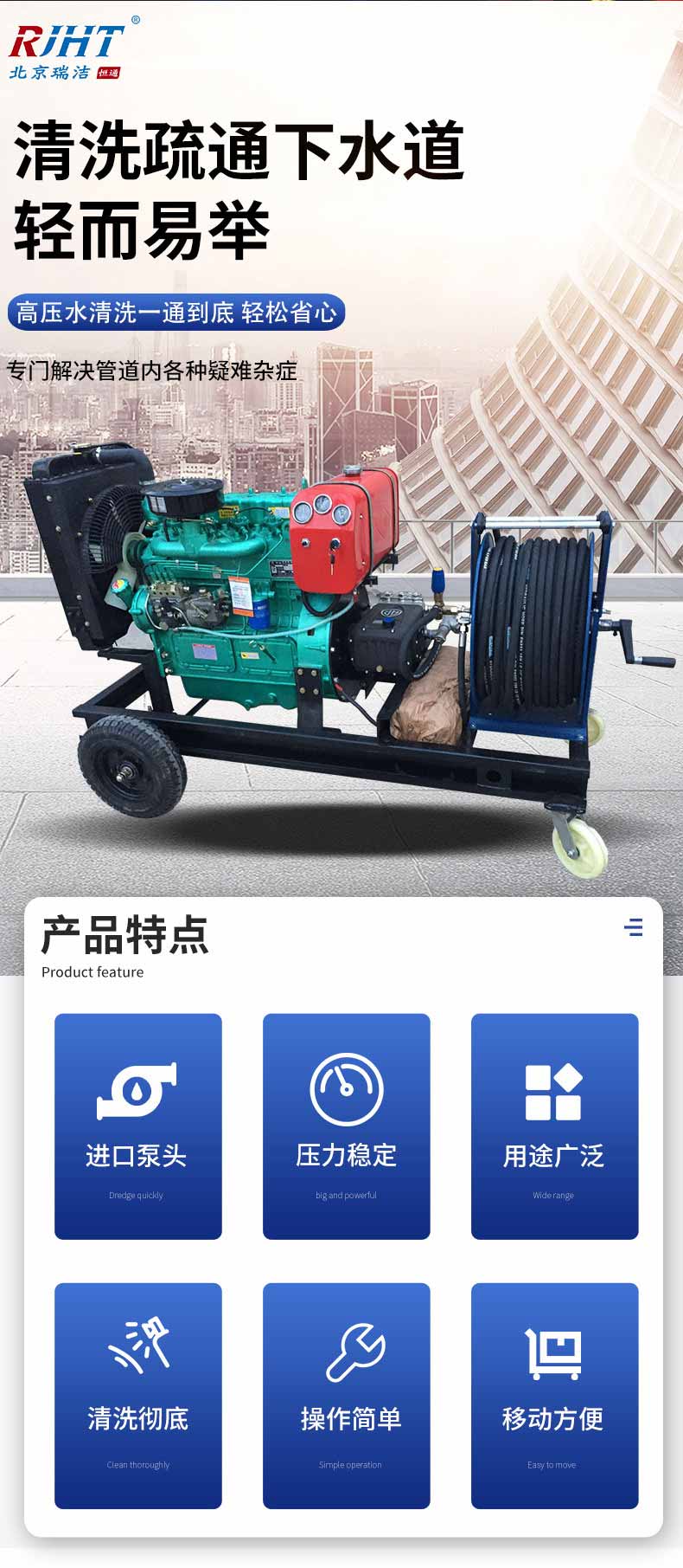 RJHT-800型 41馬力柴油機(jī)驅(qū)動(dòng)的大流量高壓管道疏通清洗機(jī),采用意大利進(jìn)口高壓泵,壓力調(diào)節(jié)裝置、不銹鋼壓力表和精密過(guò)濾器等多種安全防護(hù)裝置,具有安全性高,使用操作穩(wěn)定等優(yōu)點(diǎn)。