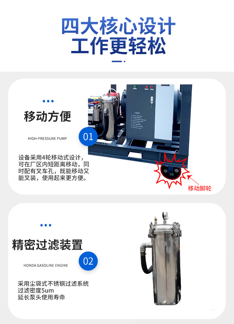 2800公斤柴油機(jī)超高壓清洗機(jī),大壓力、大流量,適用于除漆除銹、冷凝器、換熱器等工業(yè)列管清洗和疏通,大輪牽引方便于在車間內(nèi)隨意移動(dòng)。